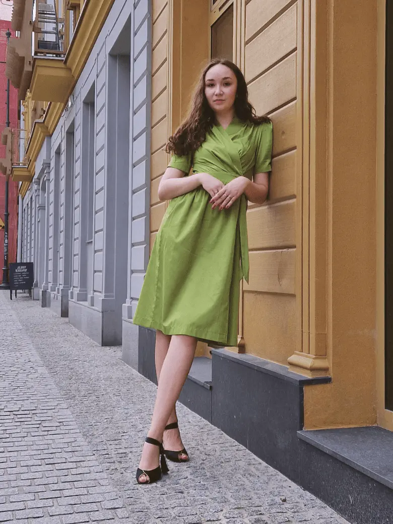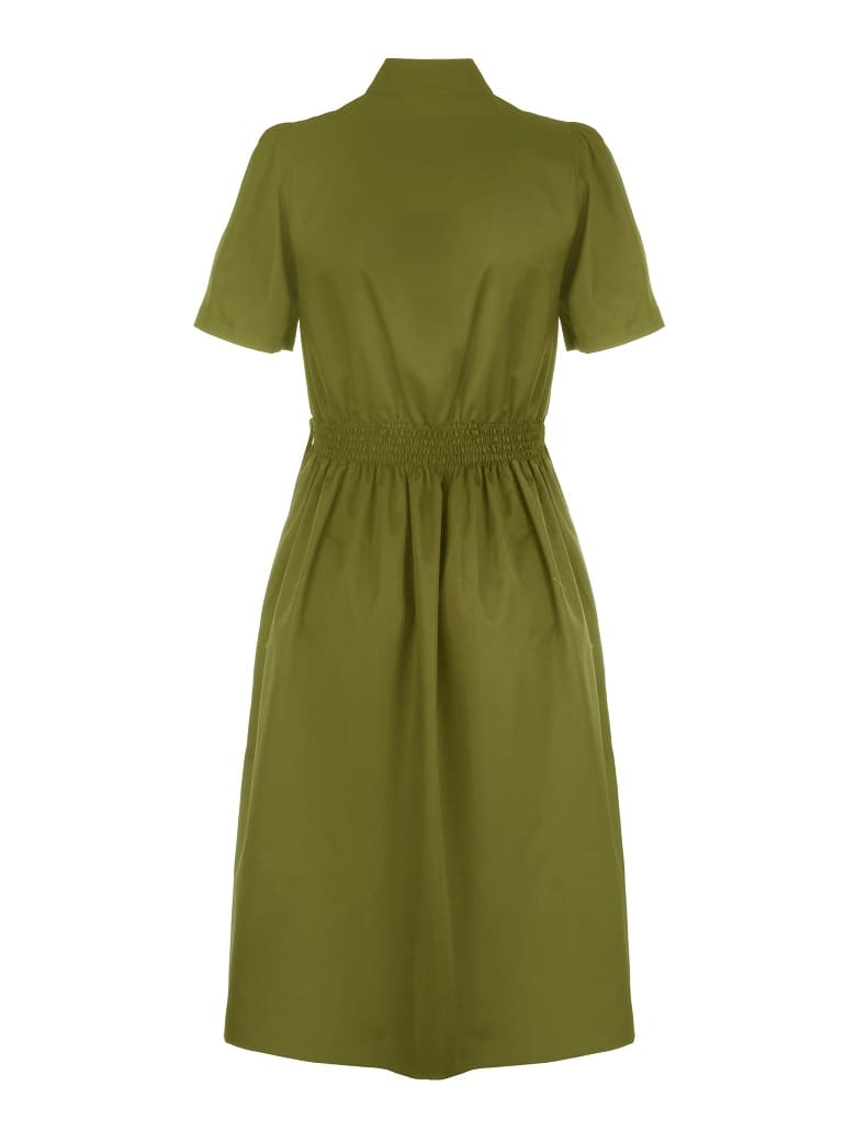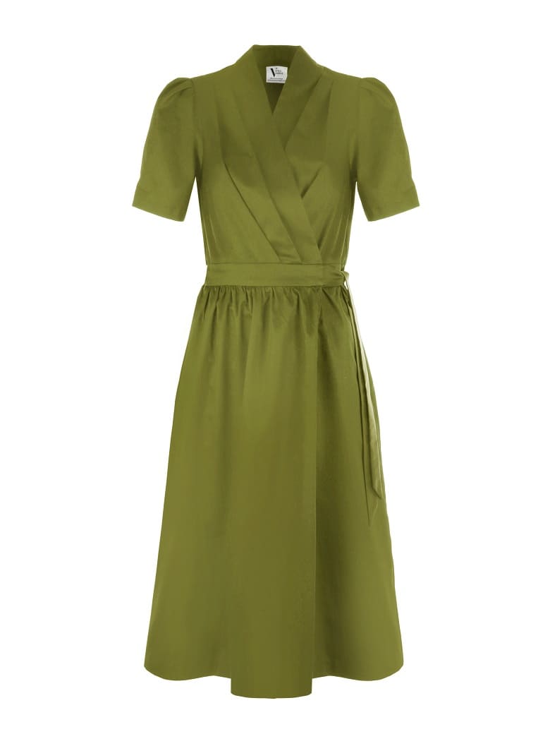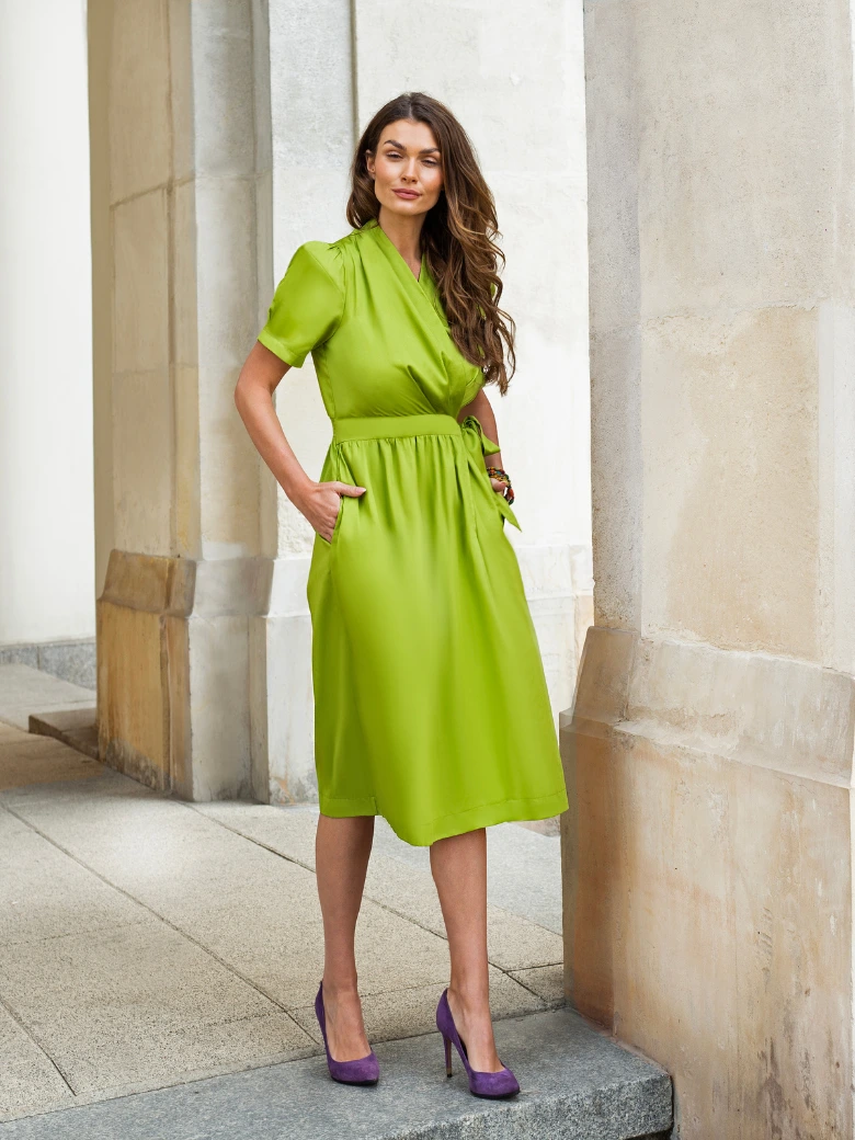 Sukienka Madame Edith – inspirowana modą lat 40, posiada jednak nowoczesny twist. Powstała z myślą o kobietach, które cenią sobie elegancję w codziennych stylizacjach. Jej fason jest unikatowy, wydobędzie walory każdej kobiecej sylwetki, dzięki paskowi, który idealnie podkreśli talię. Model zaprojektowany ze szczególną dbałością o detale: z tyłu ma wszytą gumkę, która sprawia, że sukienka jeszcze lepiej dopasowuje się do figury, guziki umieszczone pod spodem sprawiają, że pięknie układa się na ciele a haftki trzymają wszystko na miejscu tak, by podczas noszenia nie odstawały żadne zagięcia.